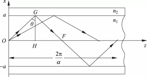 我們?cè)趫D6的階躍折射率多模光纖中選取光線OGF進(jìn)行分析,假定它的空間周期也為2π/α,則有